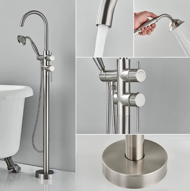 A torneira de chão para banheira em níquel escovado é a escolha perfeita para quem busca um design moderno, acabamento sofisticado e funcionalidade premium. Ideal para banheiras de apoio (freestanding), ela combina elegância e desempenho em uma peça de alto padrão, trazendo um toque de luxo e praticidade ao banheiro.