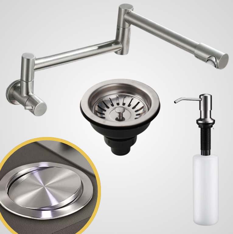 Kit de Cozinha 4 Peças Luxo em Níquel Escovado Torneira Articulada + Dispenser + Válvula + Lixeira Embutida 9L